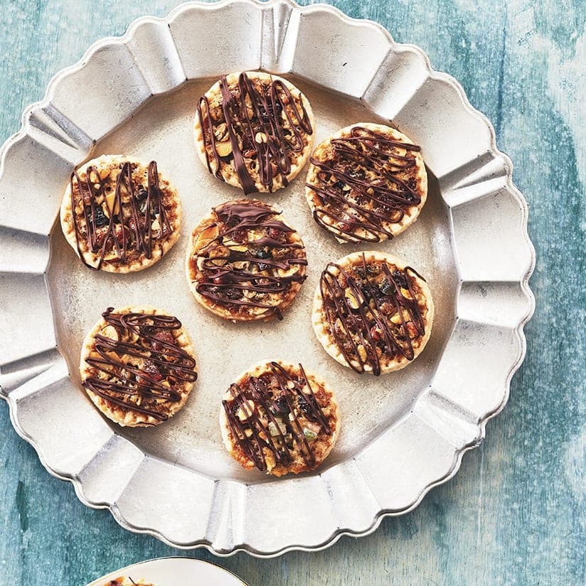 - 3. Cuire au four, sur la grille du milieu, de 25 à 30 minutes, ou jusqu'à ce que la garniture soit complètement prise et bien dorée. Laisser refroidir complètement en laissant dans les moules. Faire fondre le chocolat au micro-ondes, 20 secondes à la fois, en mélangeant entre chaque fois. À l'aide d'une fourchette, faire couler des filets de chocolat partout sur les tartelettes. Congeler sur la plaque pendant quelques heures. Transférer ensuite dans un contenant hermétique, en séparant les étages par des feuilles de papier parchemin, si nécessaire. (Les tartelettes se conservent jusqu'à 3 mois au congélateur.)
