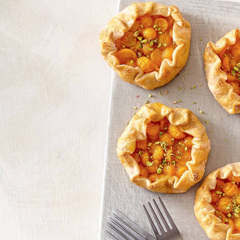 3. Cuire sur la grille inférieure du four préchauffé à 400 °F (200 °C) pendant 30 minutes ou jusqu'à ce que les tartelettes soient dorées. Déposer la plaque sur une grille et laisser refroidir au moins 15 minutes avant de servir. (Les tartelettes se conserveront jusqu'à 2 jours à la température ambiante ou jusqu'à 1 mois au congélateur.) Servir les tartelettes chaudes ou tièdes, parsemées de pistaches, si désiré.