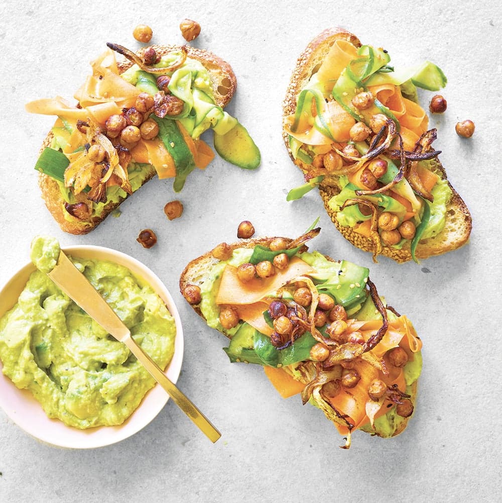 Étendre généreusement la tartinade à l’avocat sur le pain, puis garnir des pois chiches et des légumes marinés. Accompagner de croustilles nature, si désiré.