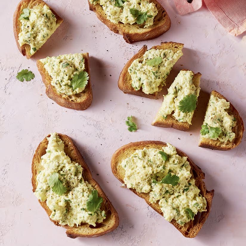 - Tartiner sur du pain. Couper en 2 ou 3 morceaux. Garnir avec des feuilles de coriandre.