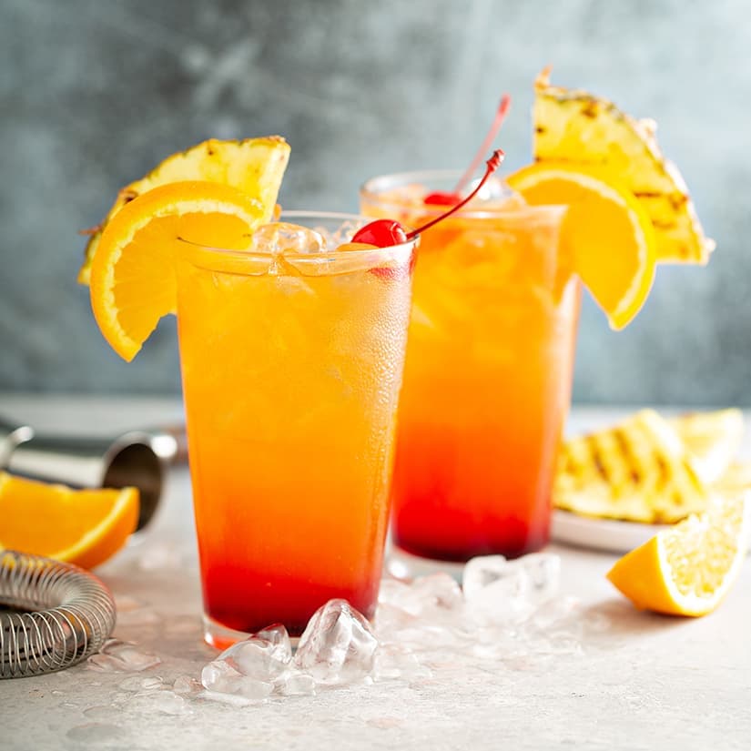 - Dans un mélangeur électrique ou un secoueur, mélanger tous les ingrédients, sauf la grenadine et le quartier de lime, avec de la glace pilée.