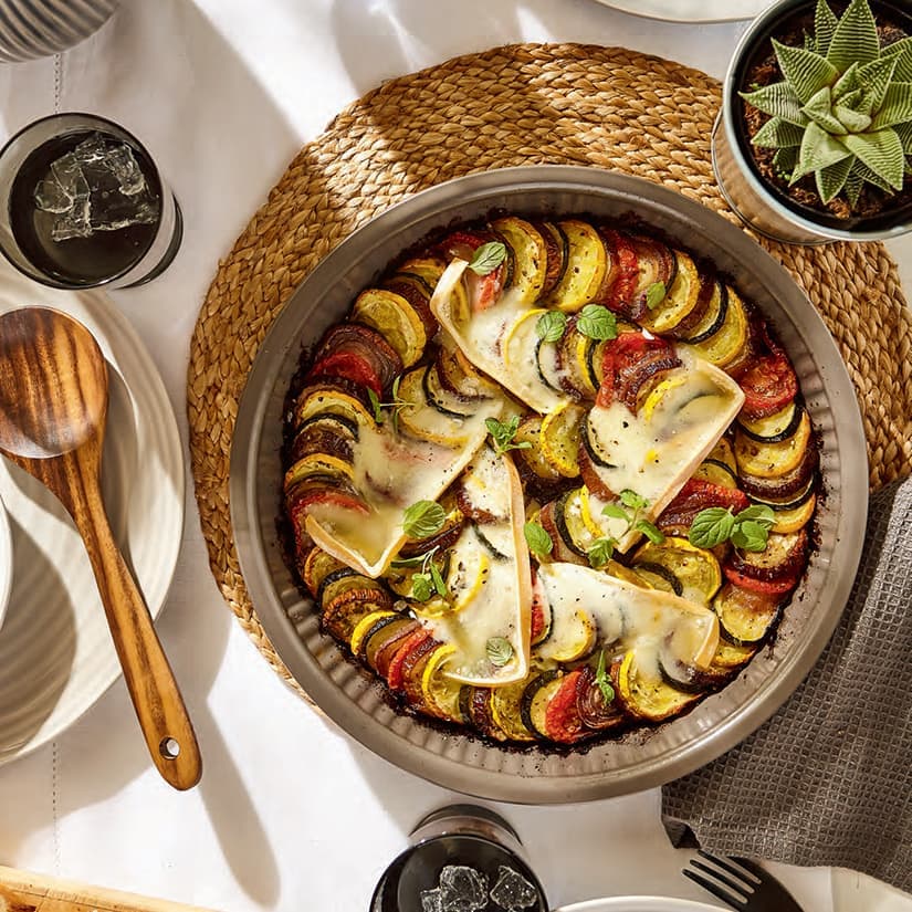 - Cuire au four préchauffé à 400 °F (200 °C) pendant 1 heure ou jusqu'à ce que les légumes soient bien tendres. Retirer le tian du four. Couvrir des tranches de fromage et poursuivre la cuisson sous le gril du four 5 minutes ou jusqu'à ce que le fromage soit fondu. Laisser reposer 10 minutes avant de servir.
