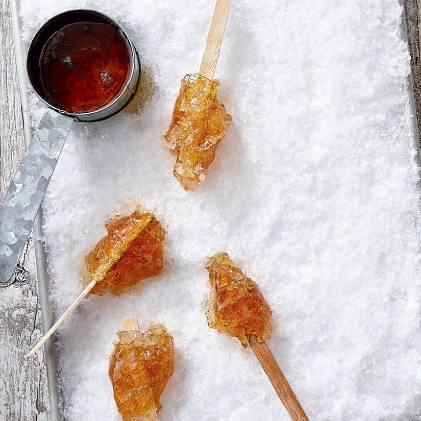 - À l'aide d'une tasse à mesurer en verre ou d'une louche en métal, verser le sirop sur la neige réservée en formant des traînées de 6 po (15 cm) de longueur. Attendre quelques secondes avant d'enrouler la tire autour de bâtonnets de bois.
