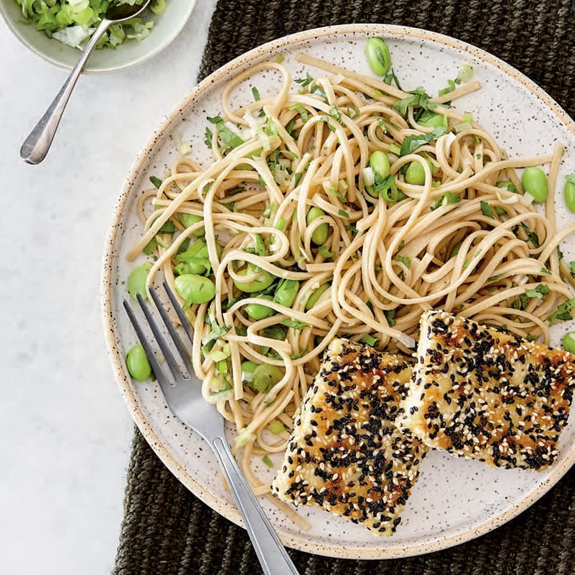 - Dans un petit bol, à l'aide d'un fouet, mélanger l'huile, le jus de lime, la sauce soya, le miel, le gingembre et l'ail. Dans un grand bol, mélanger environ deux tiers de la sauce au gingembre, les nouilles aux édamames et les oignons verts. Parsemer de coriandre, si désiré. Servir les nouilles avec le tofu et le reste de la sauce.