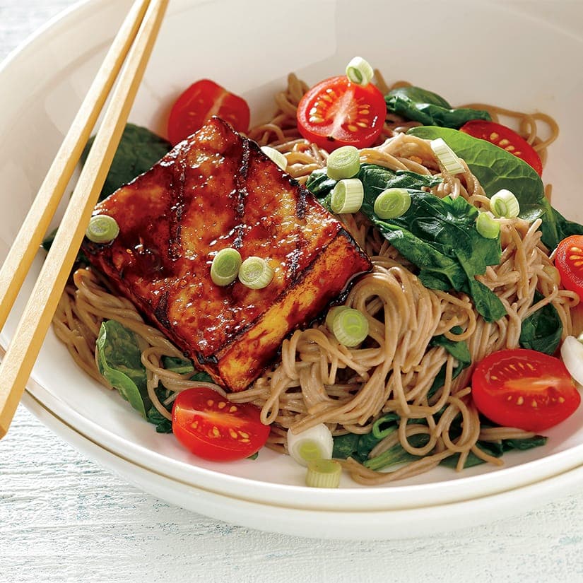 4. Entre-temps, dans une casserole d'eau bouillante, cuire les nouilles en suivant les instructions sur l'emballage. Les égoutter et les réserver. Dans la casserole, à l'aide d'un fouet, mélanger le bouillon, le beurre d'arachides, le reste de la sauce soja et le reste de la sauce aux piments jusqu'à ce que le mélange soit lisse et porter à ébullition. Réduire à feu moyen, ajouter les nouilles réservées et mélanger pour bien les enrober. Ajouter les épinards et cuire de 2 à 3 minutes ou jusqu'à ce qu'ils aient ramolli. Retirer la casserole du feu. Ajouter l'huile de sésame et mélanger. Servir le tofu réservé avec la salade de nouilles et d'épinards. Parsemer des tomates et des oignons verts. Accompagner de la sauce réservée.