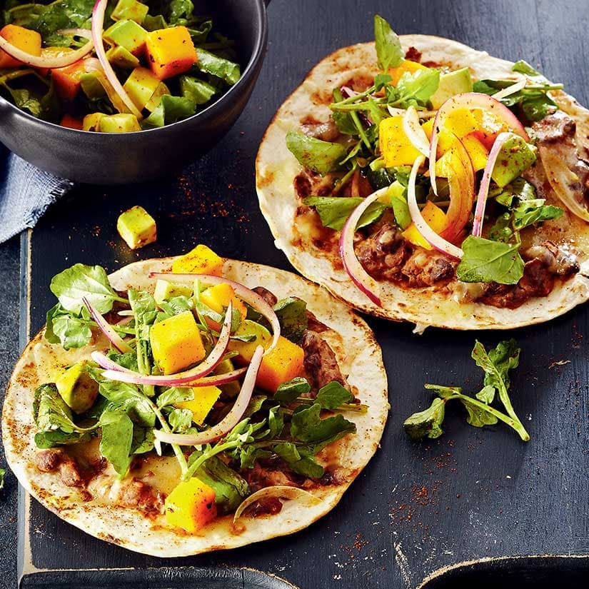 Tortillas grillées aux haricots noirs et salade avocat-mangue