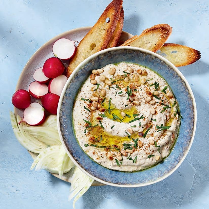 - Au moment de servir, arroser la trempette de l'huile d'olive. Parsemer d'un peu de paprika, du persil et des noix de pin. Servir avec des croûtons et des crudités, si désiré.