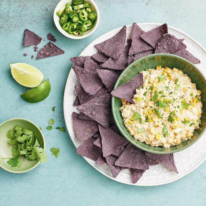 - Mettre le maïs dans un bol. Ajouter la mayonnaise et la crème sure, et mélanger pour bien enrober le maïs. Ajouter le féta, la coriandre, l'assaisonnement au chili, l'ail, le jus de lime et le piment, si désiré, et bien mélanger. Poivrer. Parsemer de coriandre hachée, si désiré, et servir avec des croustilles de maïs.