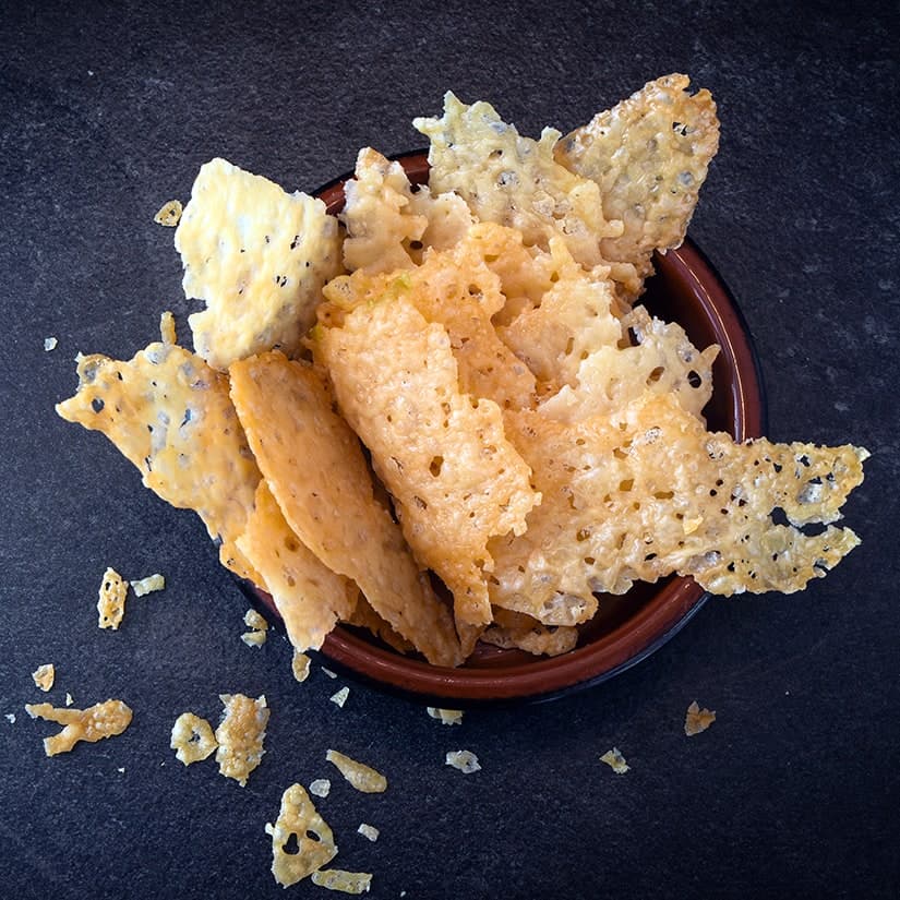 1. Préchauffer le four 375 °F, et tapisser une plaque de cuisson d'un tapis de silicone (ou de papier parchemin). Râper finement le parmesan et le cheddar. Mélanger et étendre en une fine couche sur la plaque.