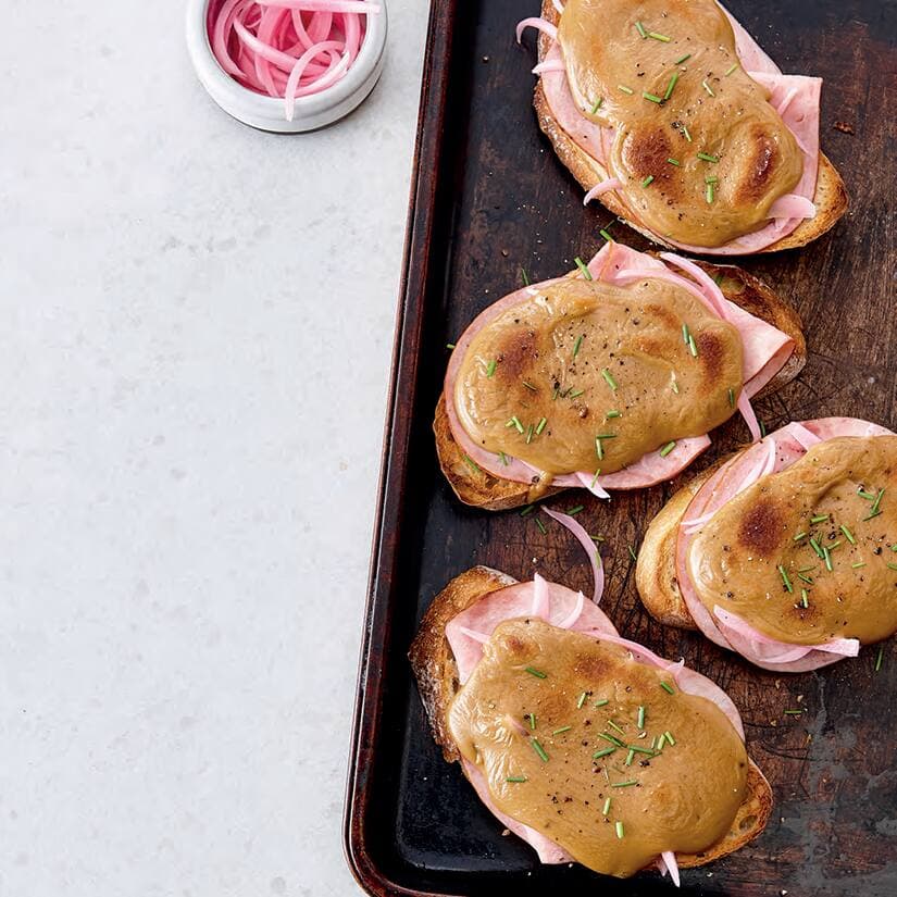 Welsh rarebit au jambon fumé et à l’oignon mariné