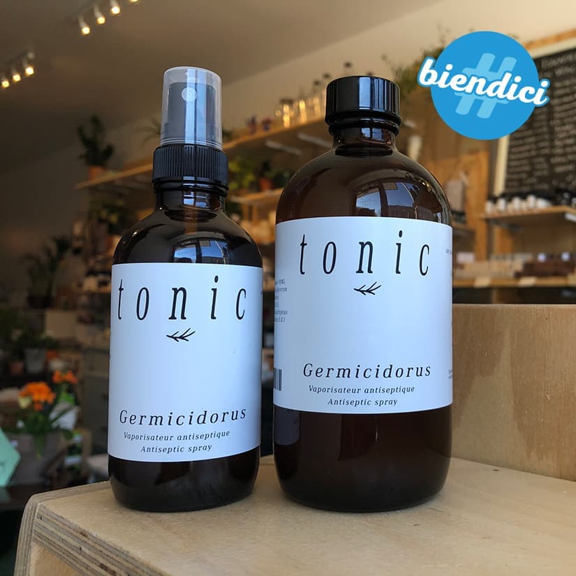 Le vaporisateur Germicidorus contient 72% d’alcool et des huiles essentielles de melaleuca et d’eucalyptus qui rappelle le spa. Le produit est vendu dans des contenants réutilisables et a été créé en partenariat avec la Distillerie du quai, située à Bécancour.