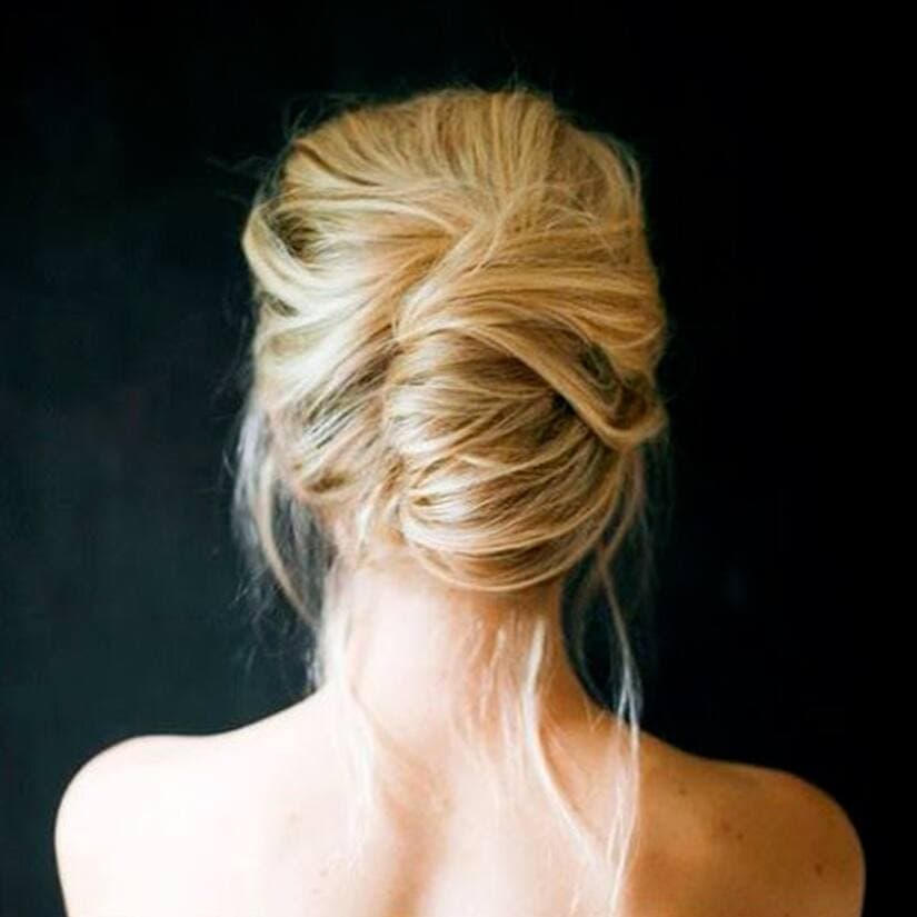 On torsade une mèche de cheveux de chaque côté de la tête et on forme une queue de cheval. On enroule les longueurs deux fois autour des mèches pour créer un chignon flou et on épingle la coiffure.