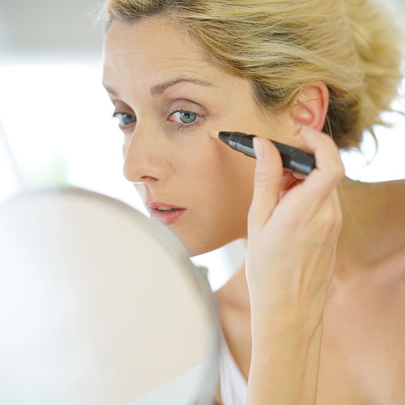 L'idée, avec le cache-cernes, c'est de masquer les ombres noires sous nos yeux. L’effet est nul quand le maquillage va se loger dans nos ridules ou craque dans les coins de l’œil. Pour éviter que cela ne se produise, Virginie suggère de fixer notre maquillage avec une poudre translucide très fine, comme une poudre minérale ou haute définition. On l’applique en petite quantité sur le cache-cernes à l’aide d’un pinceau fin. Les rides apparaissent-elles parce qu’on a mis trop de produit? Amélie recommande alors de tapoter l’excédent avec l’annulaire.