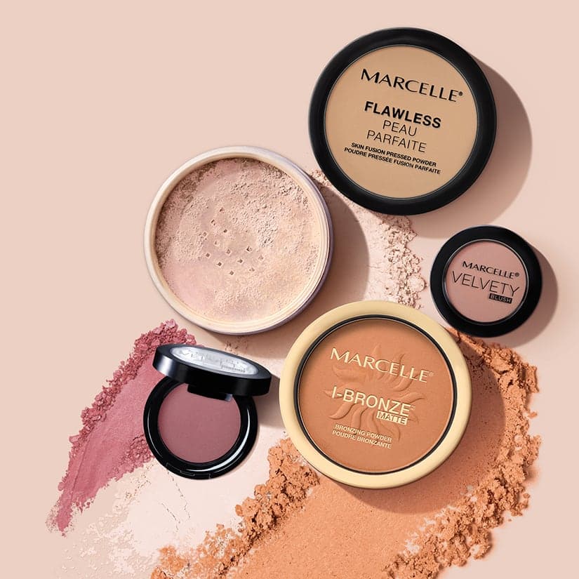 L’équipe de recherche et développement du groupe Marcelle a travaillé fort pour trouver des solutions de remplacement au talc dans ses poudres libres, pressées et bronzantes, et ses fards à joues poudre.