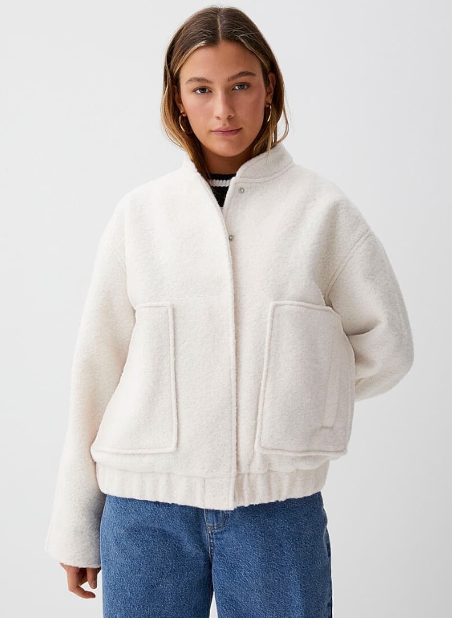 1. La veste façon laine bouillie à grandes poches, 110$ chez Simons