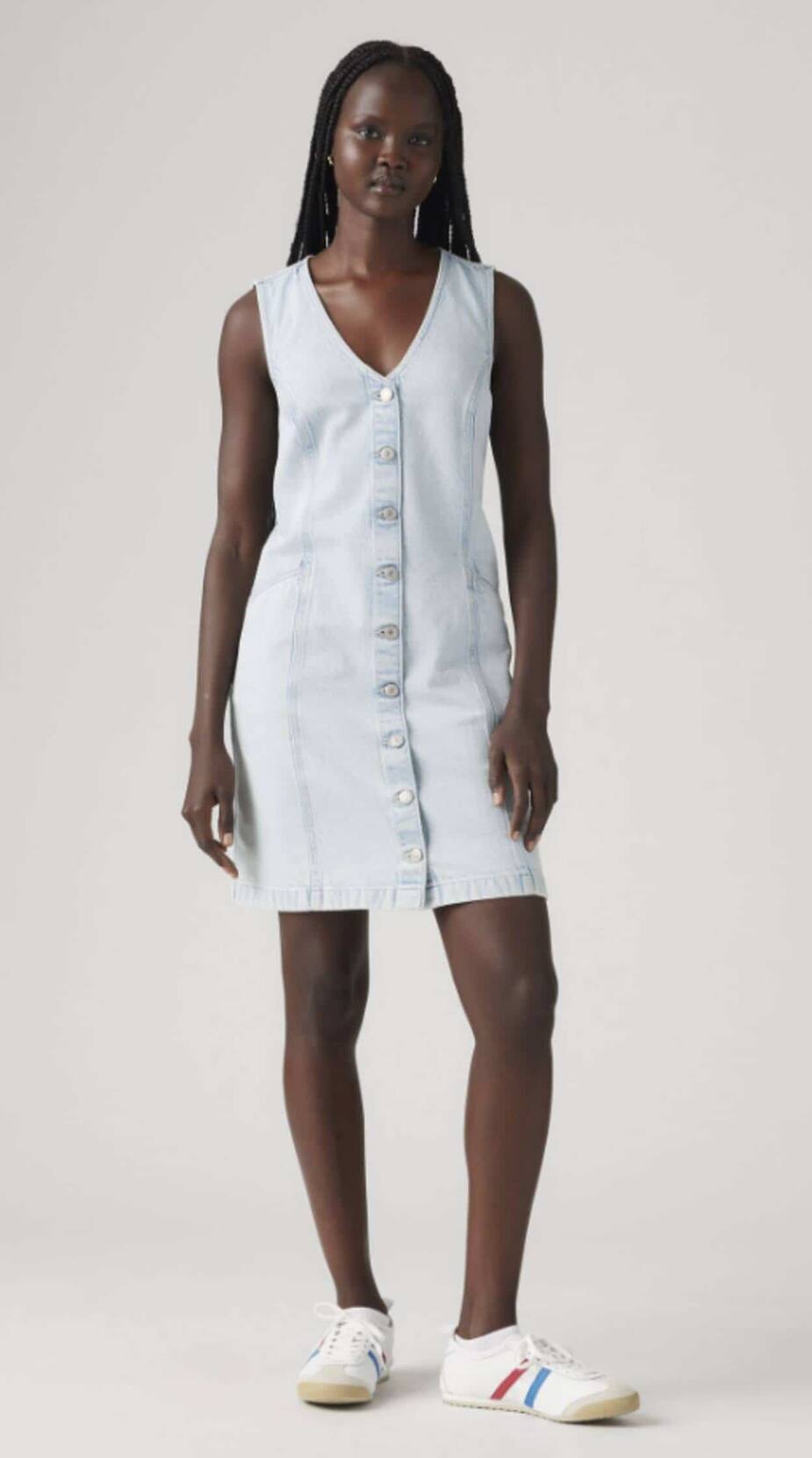 Sans compter que cette robe s’adapte à toutes les saisons! Portée avec des sandales et un sac en crochet l’été, avec des bottes hautes et un trench à l’automne, toute robe en jean se transforme réellement au gré des envies, et c’est probablement ce qui la rend si iconique.