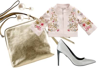 Haut en polyester et rayonne (Icône, 48$, chez Simons; TP-G). Jupe en polyester (Darling, 74$, ponyride.ca; TP-TG). Souliers en cuir synthétique (Alberto, 49,99$, chez Chaussures Pop). Sac à main en cuir (Audrey, 98$, chez Liv & Charlie). Bague en métal avec perle (Miss Ellie, 135$, chez Liv & Charlie). Boucles d’oreilles en métal avec perle (Miss Ellie, 121$, chez Liv & Charlie). Bracelet en métal avec perles en plastique (Expression, 26$, chez La Baie).