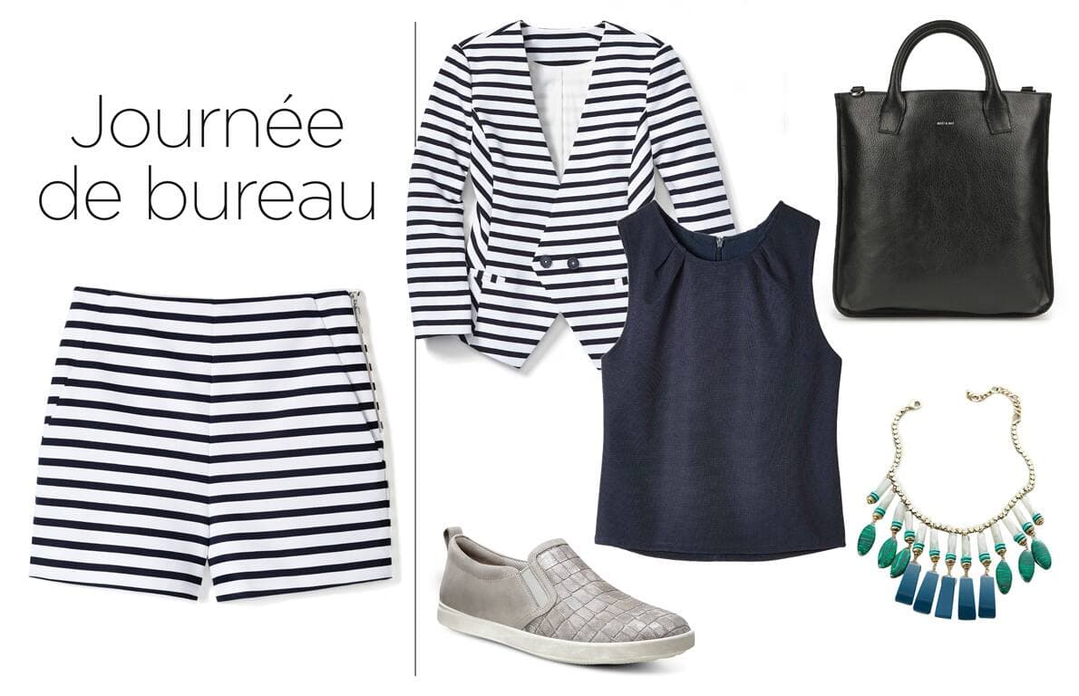 Short en coton et élasthanne (49,90$, chez RW&CO.; 0-14). Haut en élasthanne (45,90$, chez RW&CO.; TP-TG). Veste en satin, coton, polyester et élasthanne (129,90$, chez RW&CO.; 0-14). Sac à main en nylon recyclé (Matt & Nat, 150$). Chaussures en cuir (150$, chez ECCO). Collier en laiton, agate, malachite et résine (78$, chez Anthropologie).