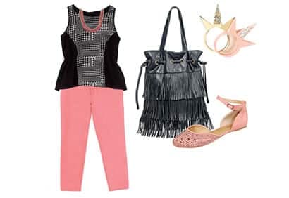 Camisole en polyester (46$, chez Reitmans; 1X-3X). Jean en coton extensible (69,99$, chez Addition Elle; 14-24). Collier (12$, chez Call it Spring). Bagues (12$ chacune, chez Aldo accessoires). Sac en similicuir (90$, chez Mango), Chaussures en similicuir (40$, chez Call it Spring).