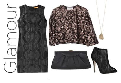 Robe en polyester, spandex et soie artificielle (Joe Fresh, 69$, TP-TG). Collier en métal (12$, chez Aldo). Pochette en cuir (ECCO, 200$). Veste en viscose et polyester (104,30$, chez Zara, P-G). Botte en textile synthétique (59,99$, chez Aldo).