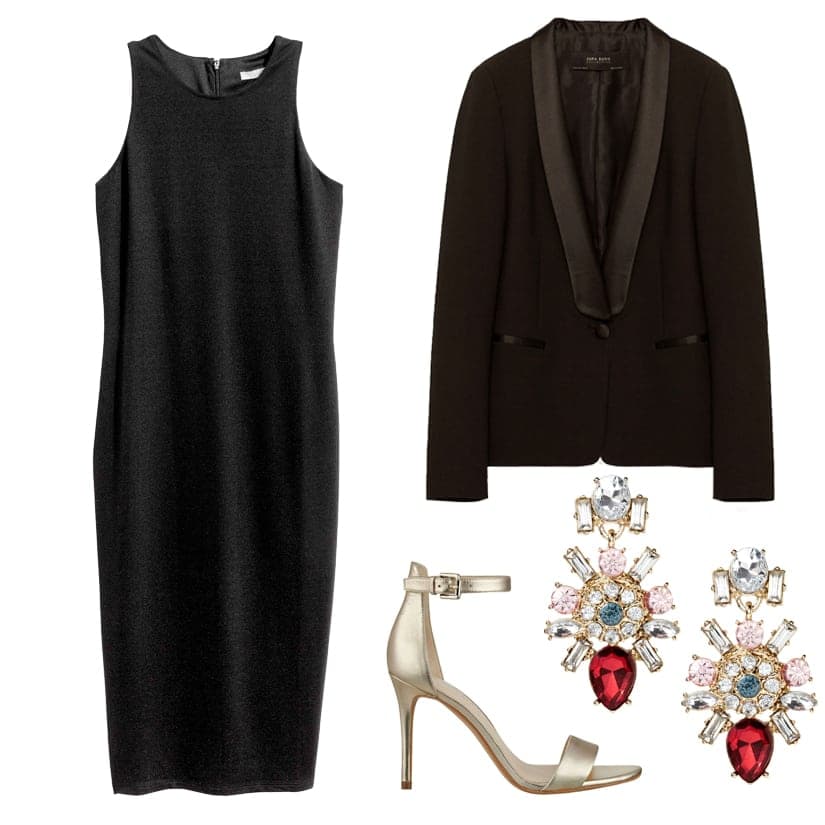 On donne à une robe noire 4 allures différentes en l’habillant d’accessoires festifs.